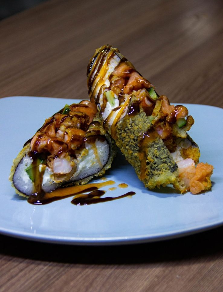 сыр, огурец, лосось, креветка в кляре, огурец (немного), соус манго чили, соус унаги