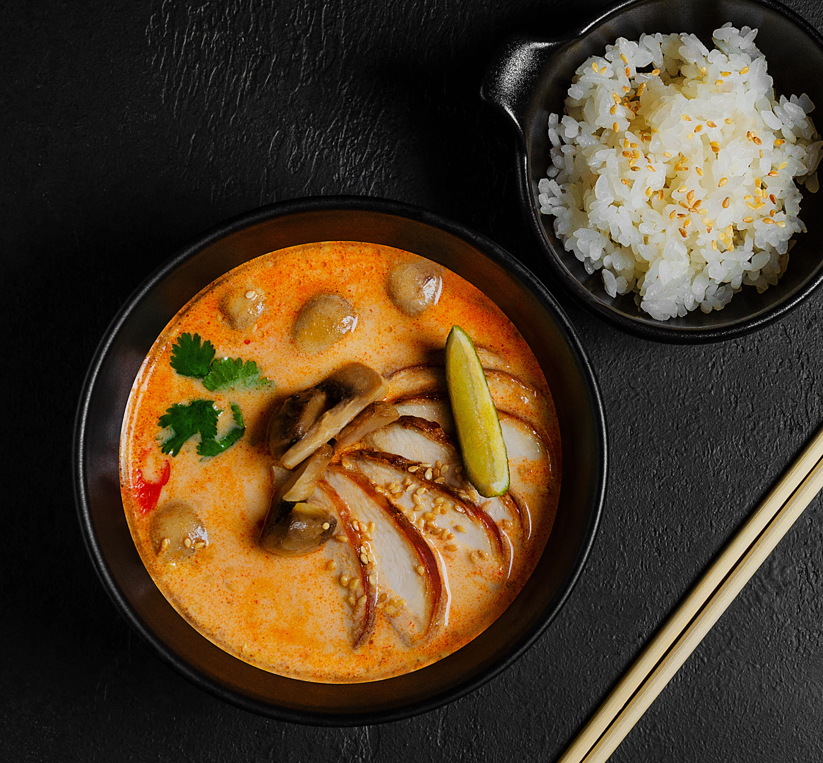Основа том ям, кокосовое молоко, рис, курица, грибы, лайм, кинза, помидоры, рисовая лапша